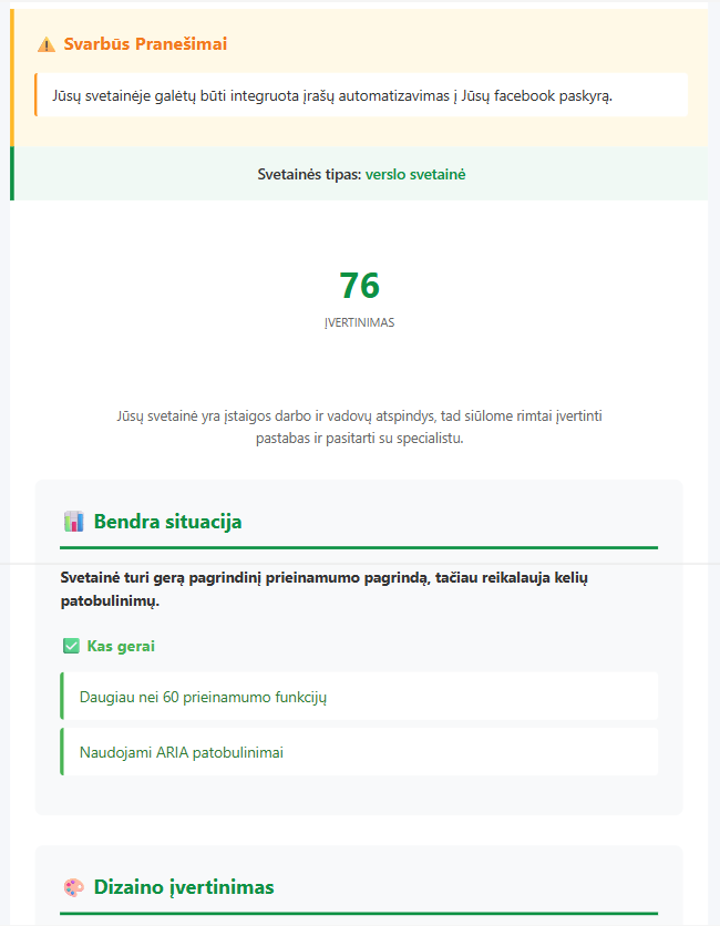 Be prieinamumo – įrankis naudoja dirbtinį intelektą, kad paryškintų painius išdėstymus, prastą navigaciją ar silpną turinio aiškumą